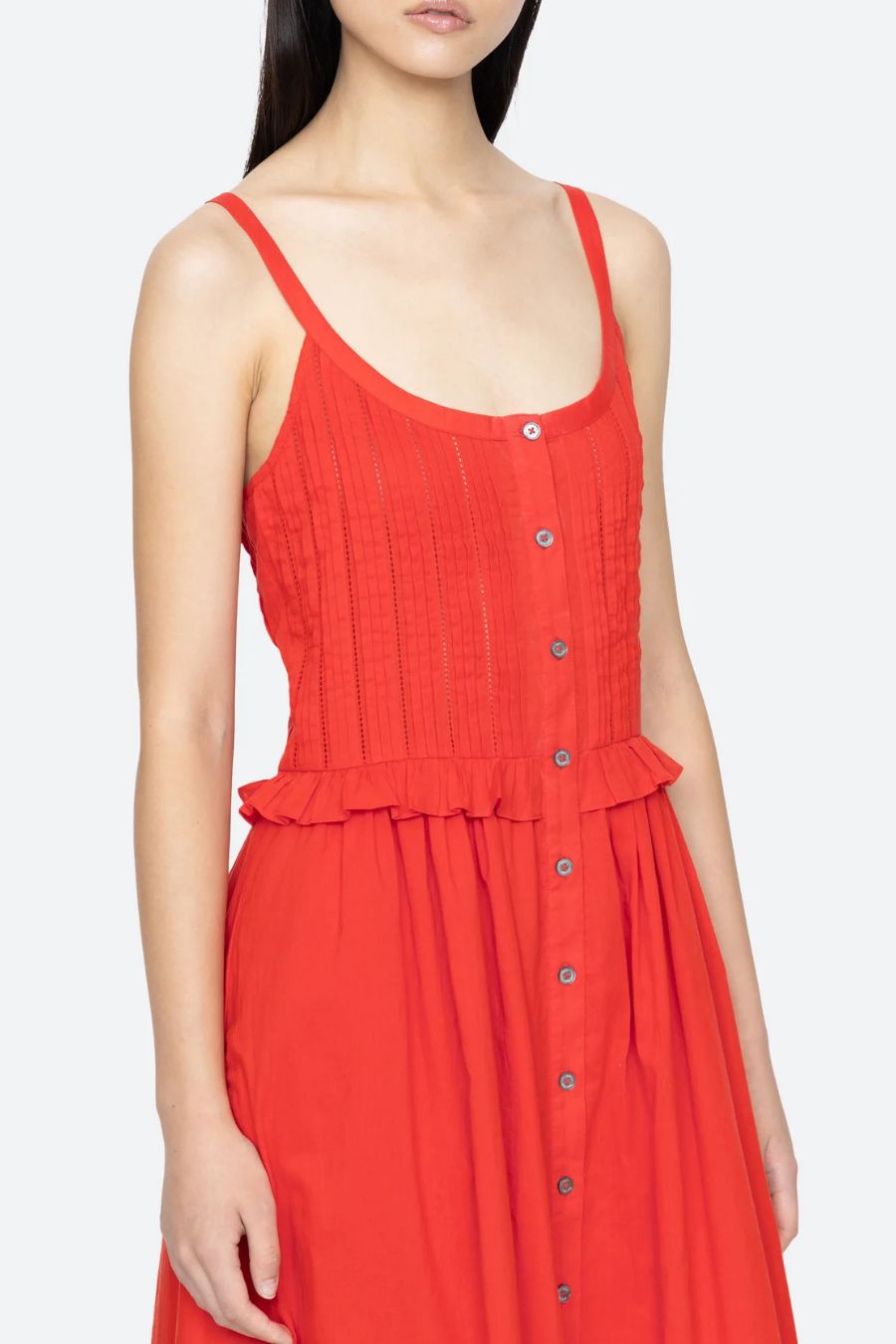 The Alberte tank dress features delicate pintuck pleats and a scoop neckline, falling in a relaxed midi silhouette for a breezy, effortless elegance.