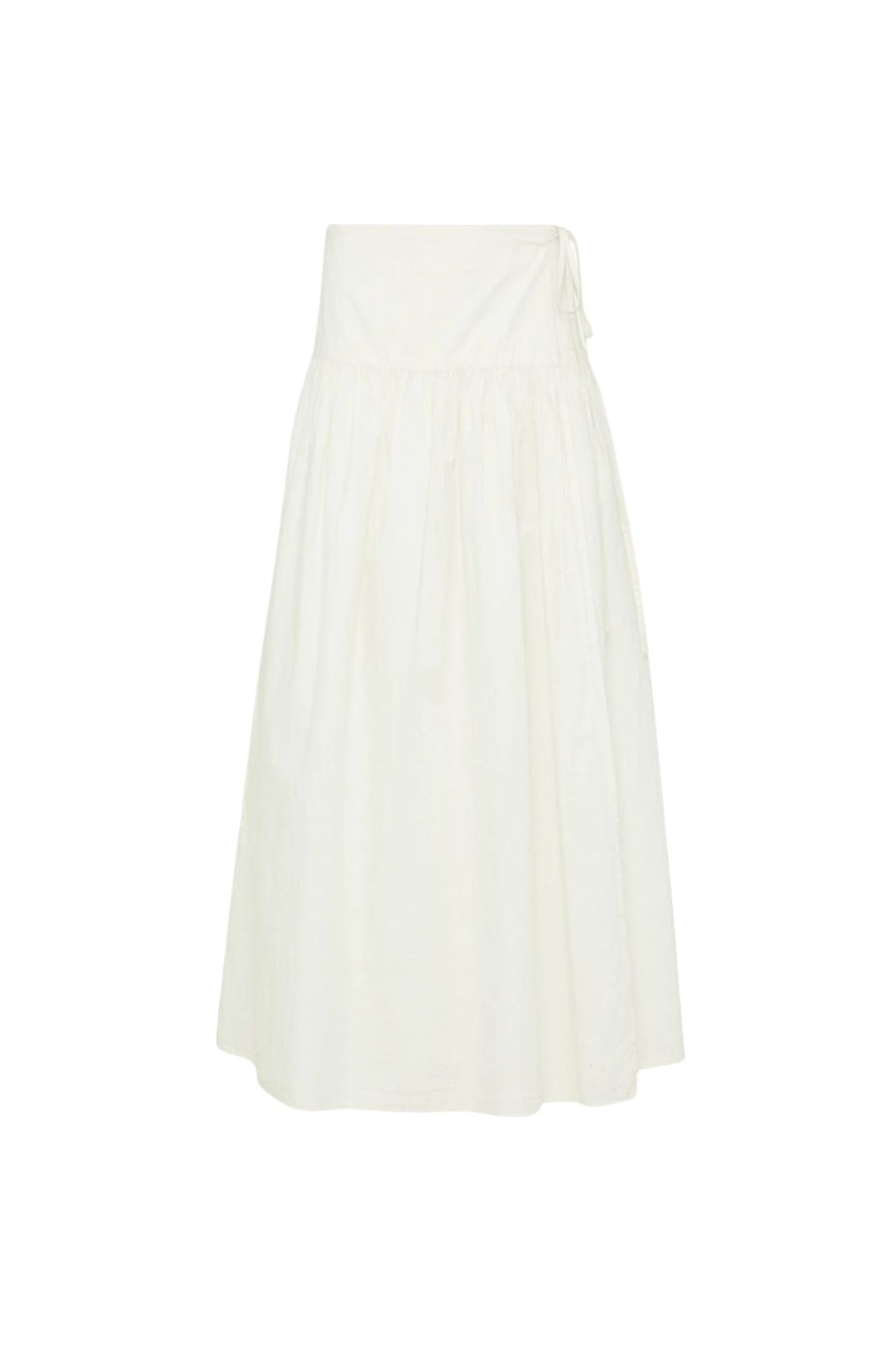 Fitted waist, wrap skirt with self tie, internal buttons, soft a-line shape