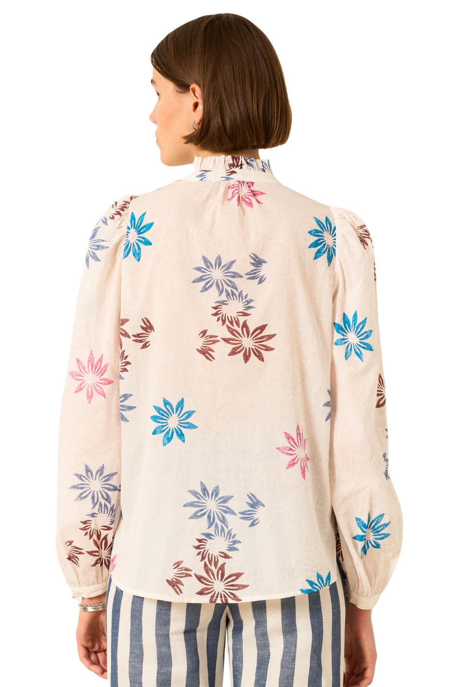 Individually cut by hand, our cotton voile shirt has long puffed sleeves, a ruffled collar, and a mother-of-pearl button front. The vintage-inspired shirt is hand-block printed with a floral motif on top of a subtle background print.