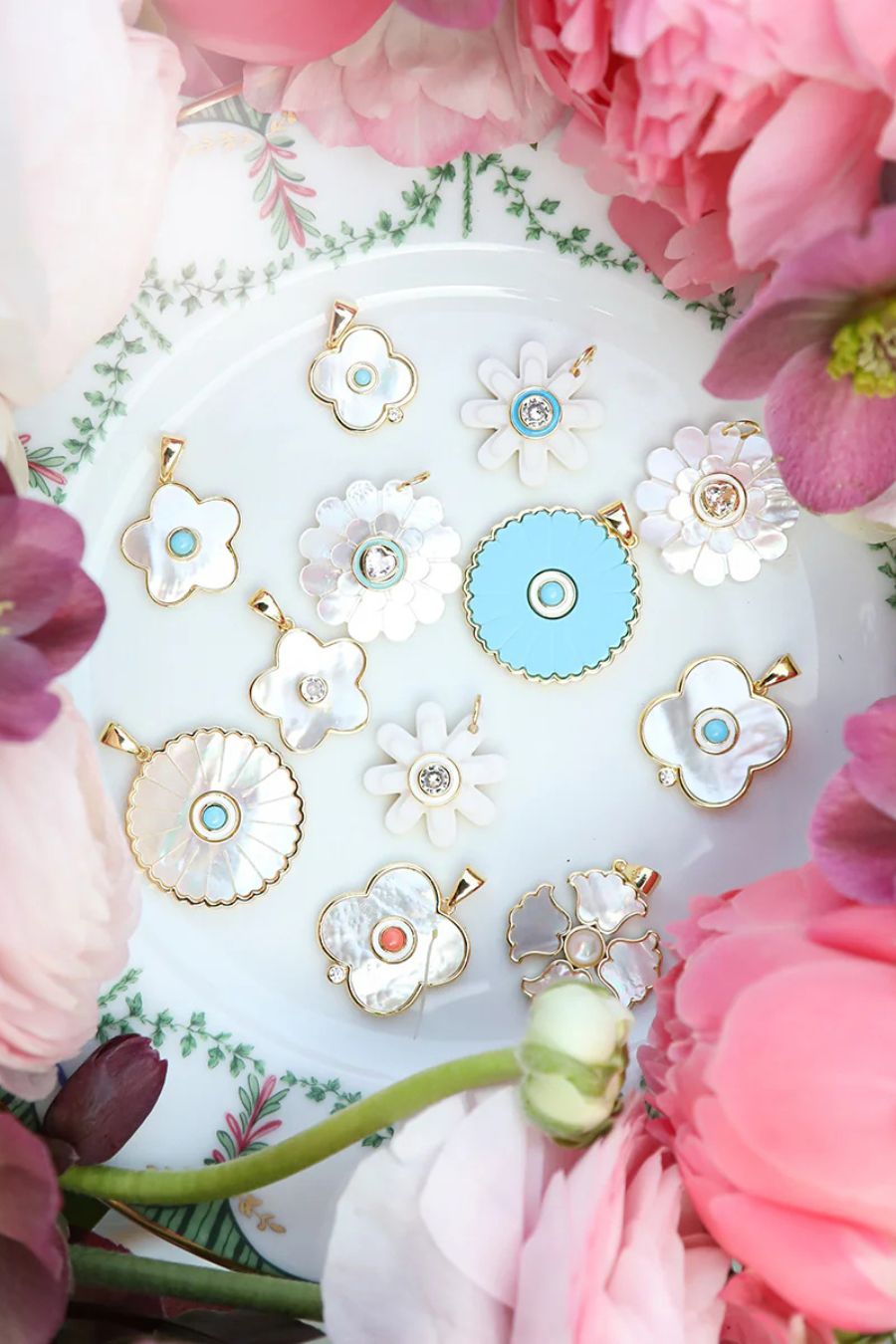 14k gold dipped classic Azalea charm with mother of pearl and white topaz center.