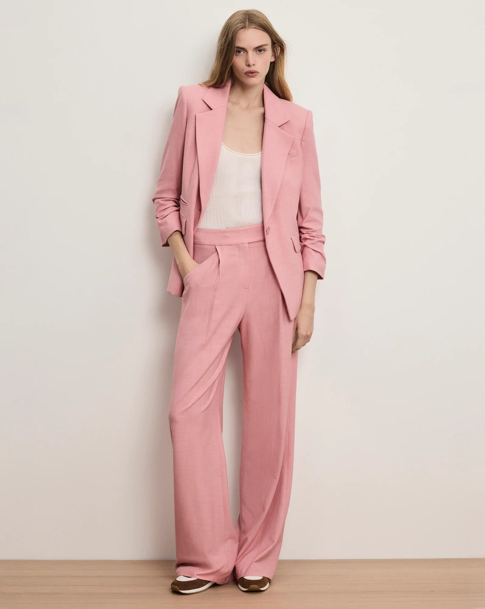 The Battista dickey jacket will quickly become your new go-to, thanks to its sleek look and impeccable fit. Expertly tailored from a premium stretch blend, this pink blazer features a classic single-breasted silhouette and pre-ruched sleeves that add an element of nonchalance. Finished with a slub texture and the slightest sheen, it's a versatile go-to for work or weekends. Switch it up with a dickey for even more styling options.
