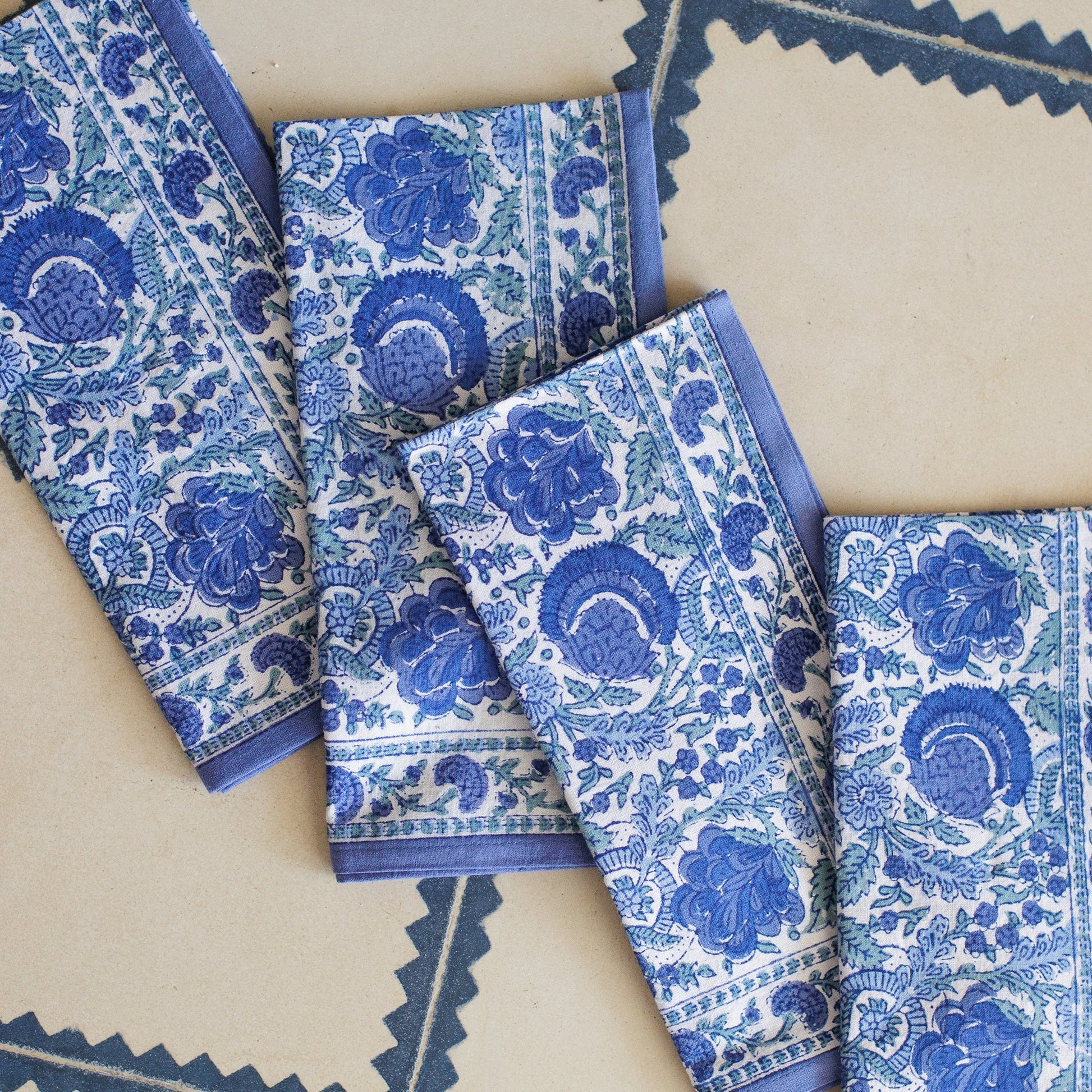 Elevate your table setting with our Bohemian Floral Azure Blue & Aqua Napkins. This set of 4 features hand block-printed florals in deep blue and aqua tones, bringing sophistication to everyday dining. Made from 100% cotton, these napkins are soft, durable, and machine washable—a perfect addition to your home.