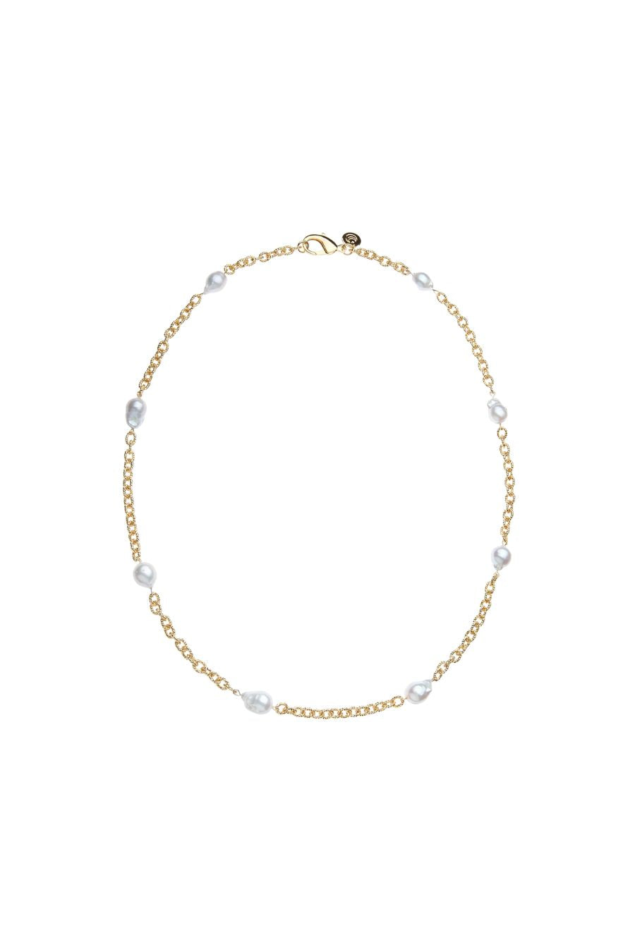 - 14k Gold-Plated Brass textured cable chain embellished with freshwater pearls.