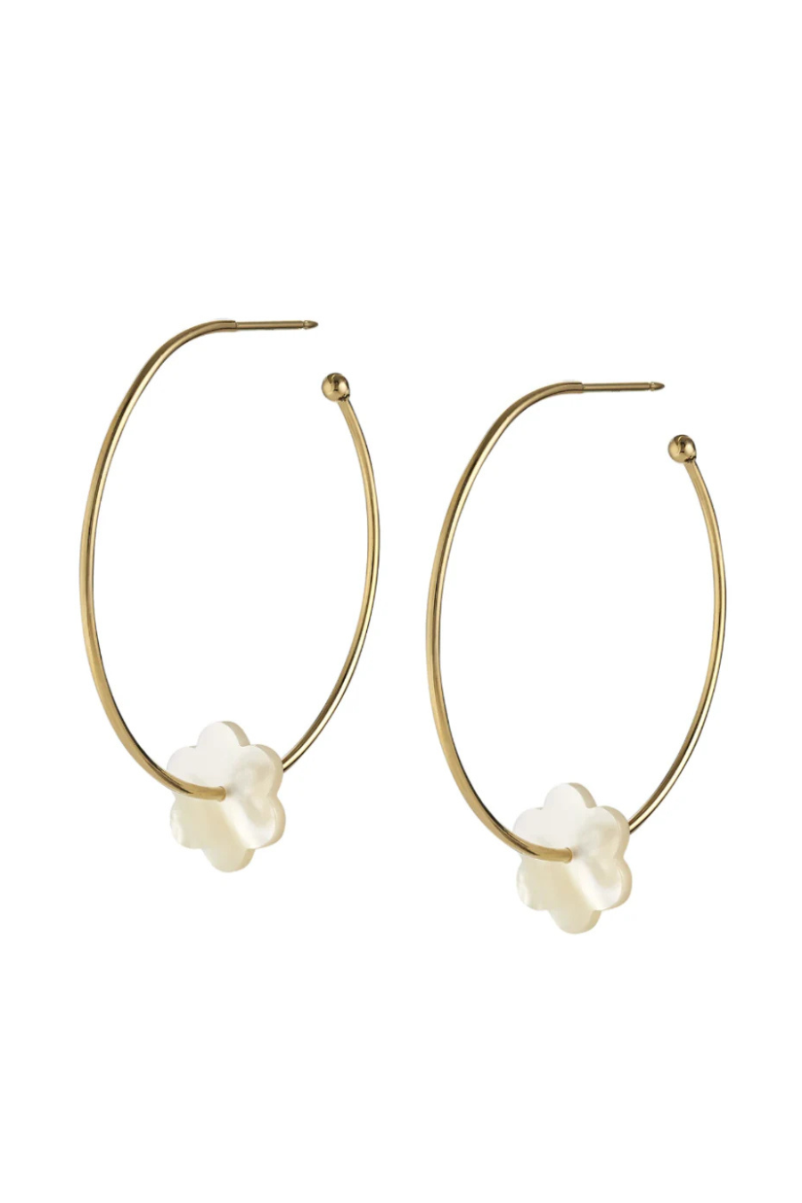 14k vermeil hoop earring with mother of pearl flower charm. 2" hoop with .65" charm.