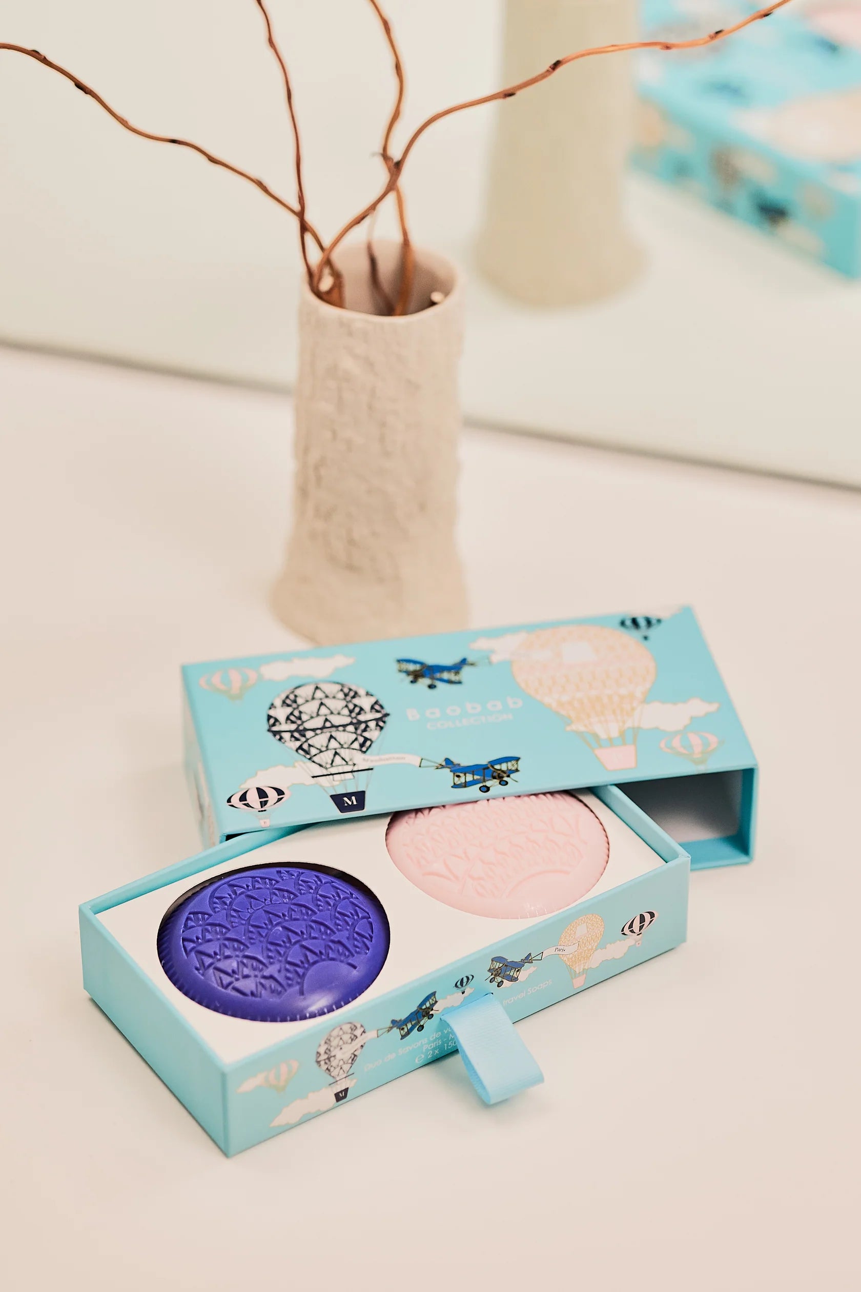 Experience the charm of Manhattan and Paris with this elegant soap duo. Presented in a turquoise-blue box decorated with hot air balloons, each soap features iconic city motifs and is enriched with baobab oil for a gentle, nourishing touch.