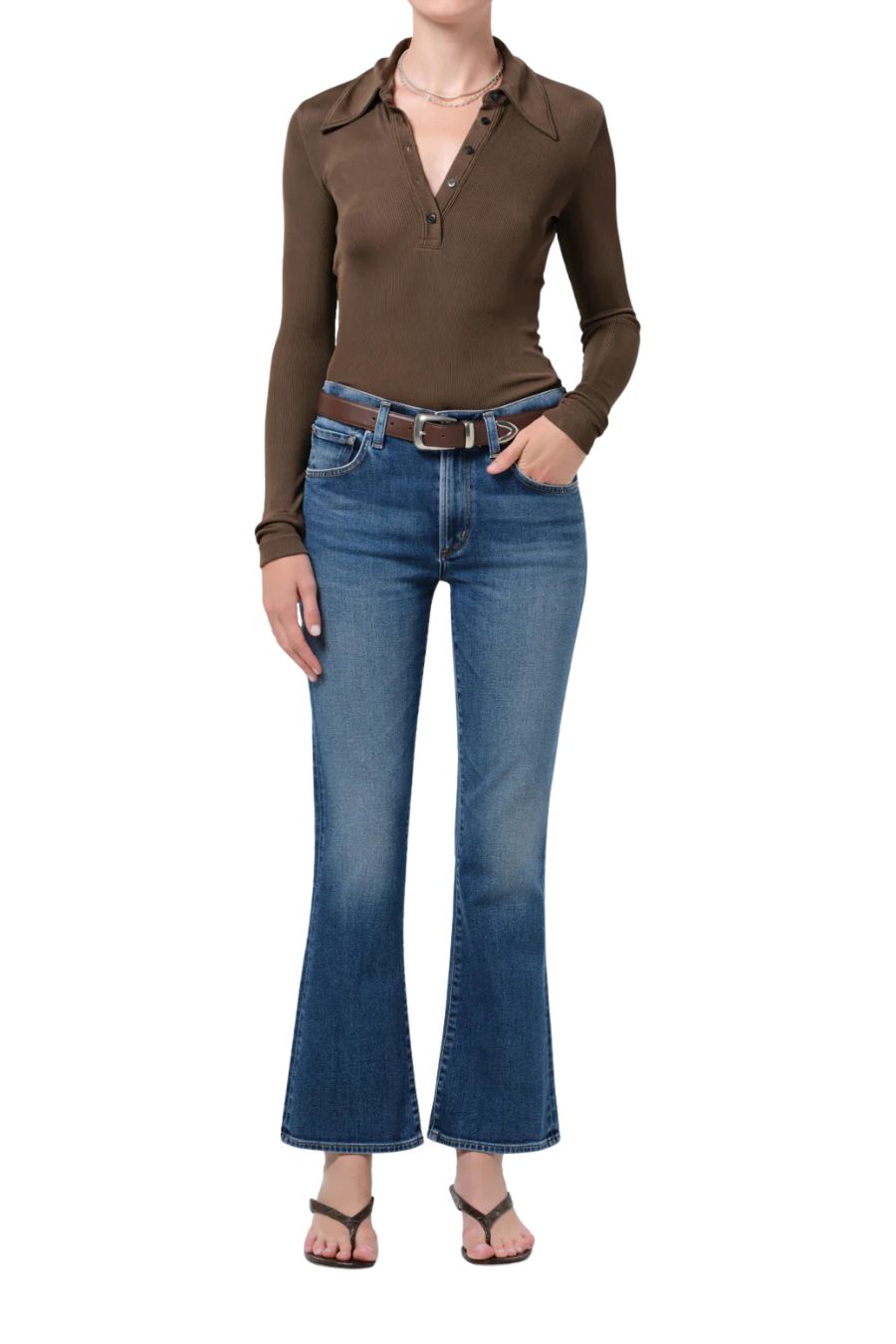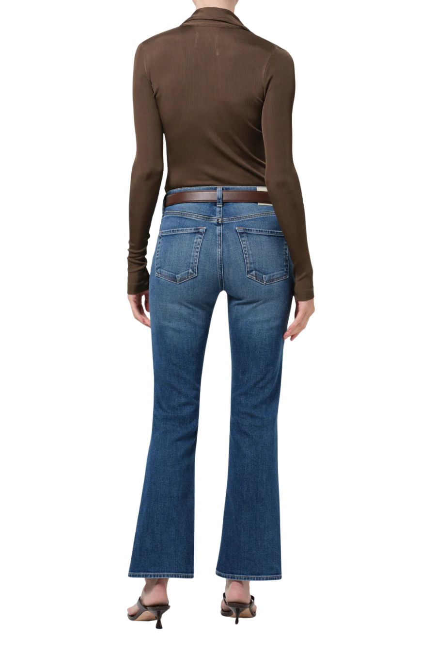 The Goldie offers a refined interpretation of ‘70s-inspired denim. Designed with a mid rise and a subtle kick-flare hem, the silhouette creates a long, balanced line that feels both timeless and modern. Crafted from comfort-stretch denim in a medium indigo wash, it has a super-soft hand and gently structured drape for all-day wearability. The perfect blend of ease and sophistication—an effortless go-to for elevated everyday dressing.