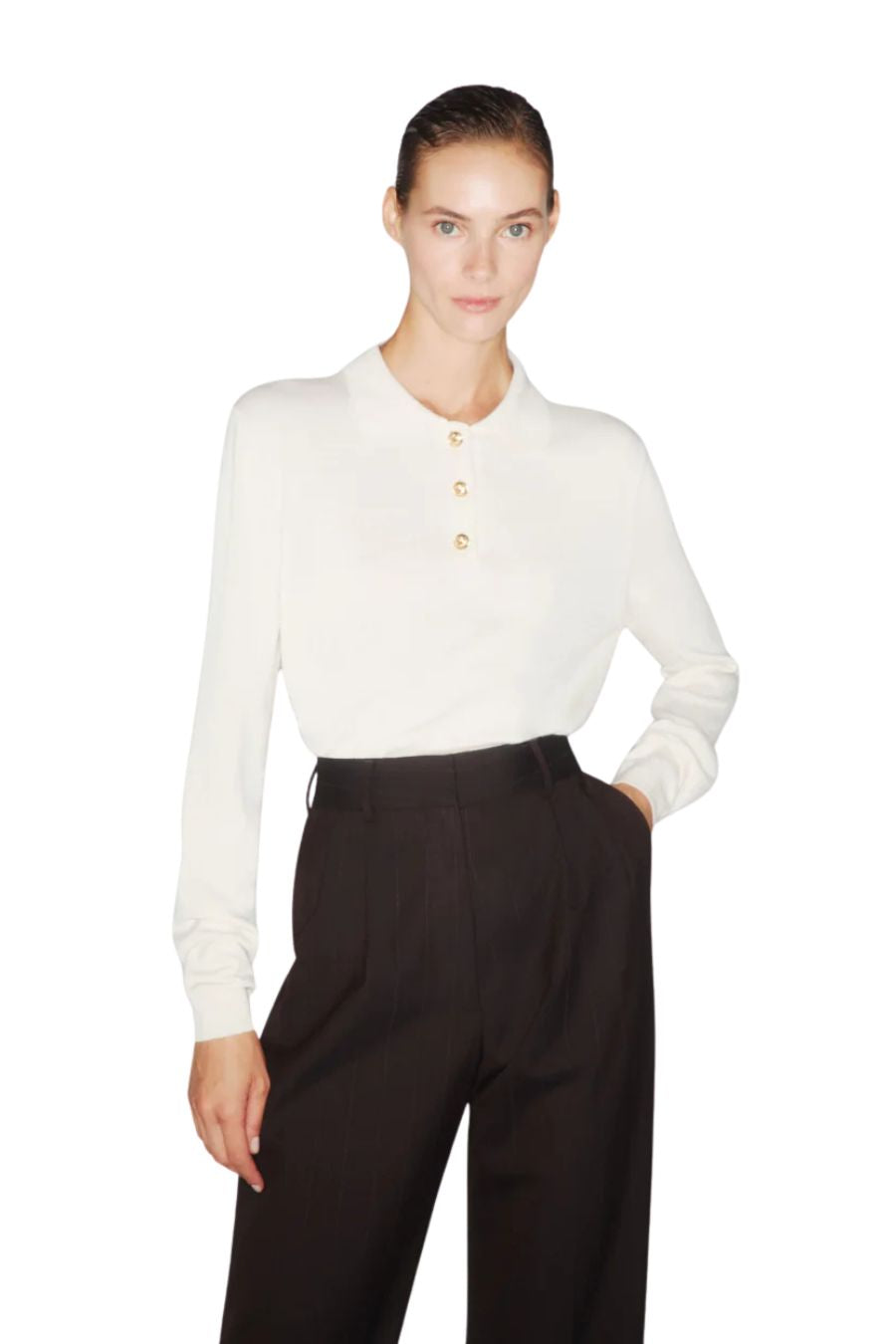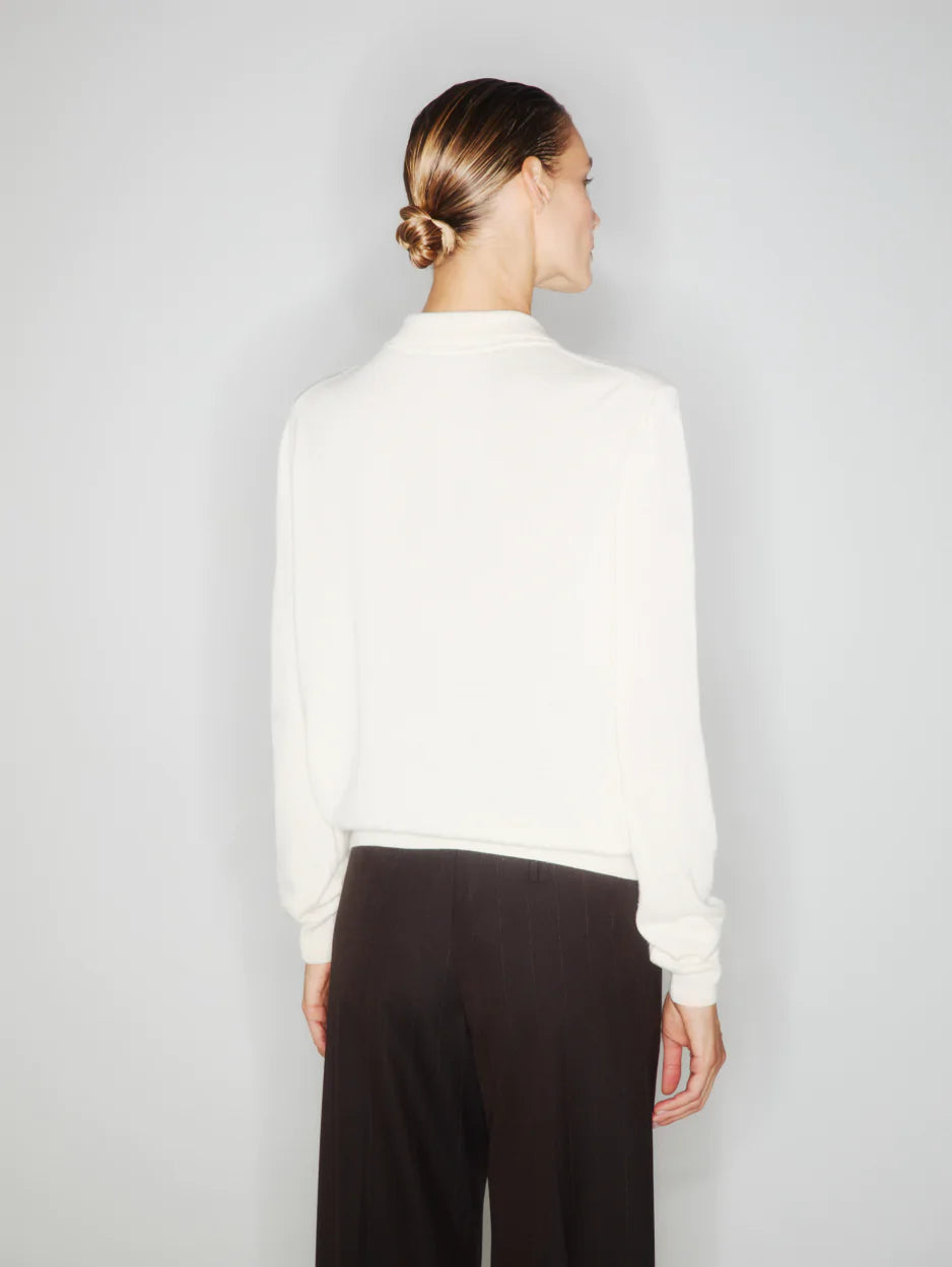 A lightweight knit for mid-season, BLAZÉ Maine Polo is made from a blend of cashmere, silk, and wool. It features a subtly cropped cut with a ribbed hem and is styled with crest-embossed buttons fastening at the collar. This polo is available in chestnut or butter cream.