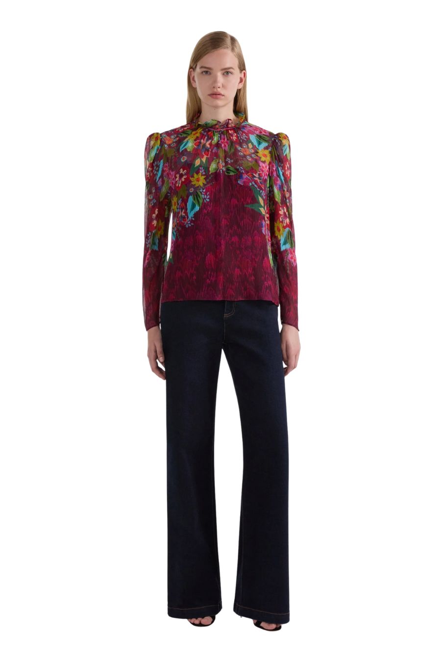 The Astilbe Bouquet print is designed to resemble an exuberant bouquet blooming across the shoulders, gradually dissolving into a soft crimson texture, at once poetic and painterly. Whether styled with tailored trousers or a flowing skirt, the Mel B Top is a versatile addition to any wardrobe.