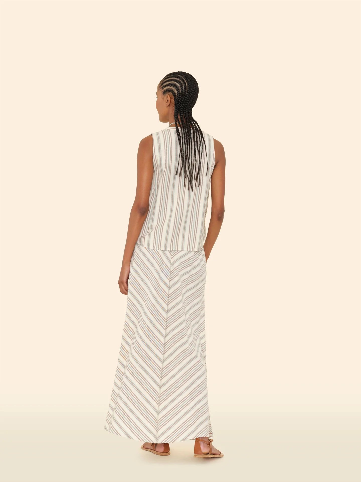 Striped Delight. Mikayla is made in our new midweight striped cotton. This A-line pull on skirt features a flat front waistband and elasticized back, faux wrap detail, and side seam pockets.