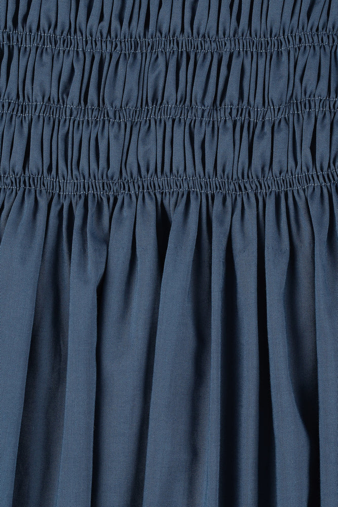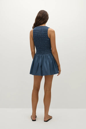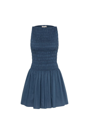 A beloved and signature silhouette for FAITHFULL with an effortlessly wearable shape and feminine undertone. Featuring a high-cut straight neckline, it is a sleeveless mini dress with a shirred bodice. It gathers slightly at the waist before falling into a sweet, A-line skirt that crops short on the body. Designed from 100% BCI Certified cotton in a vintage navy, style with a simple ballet flat for everyday dressing.