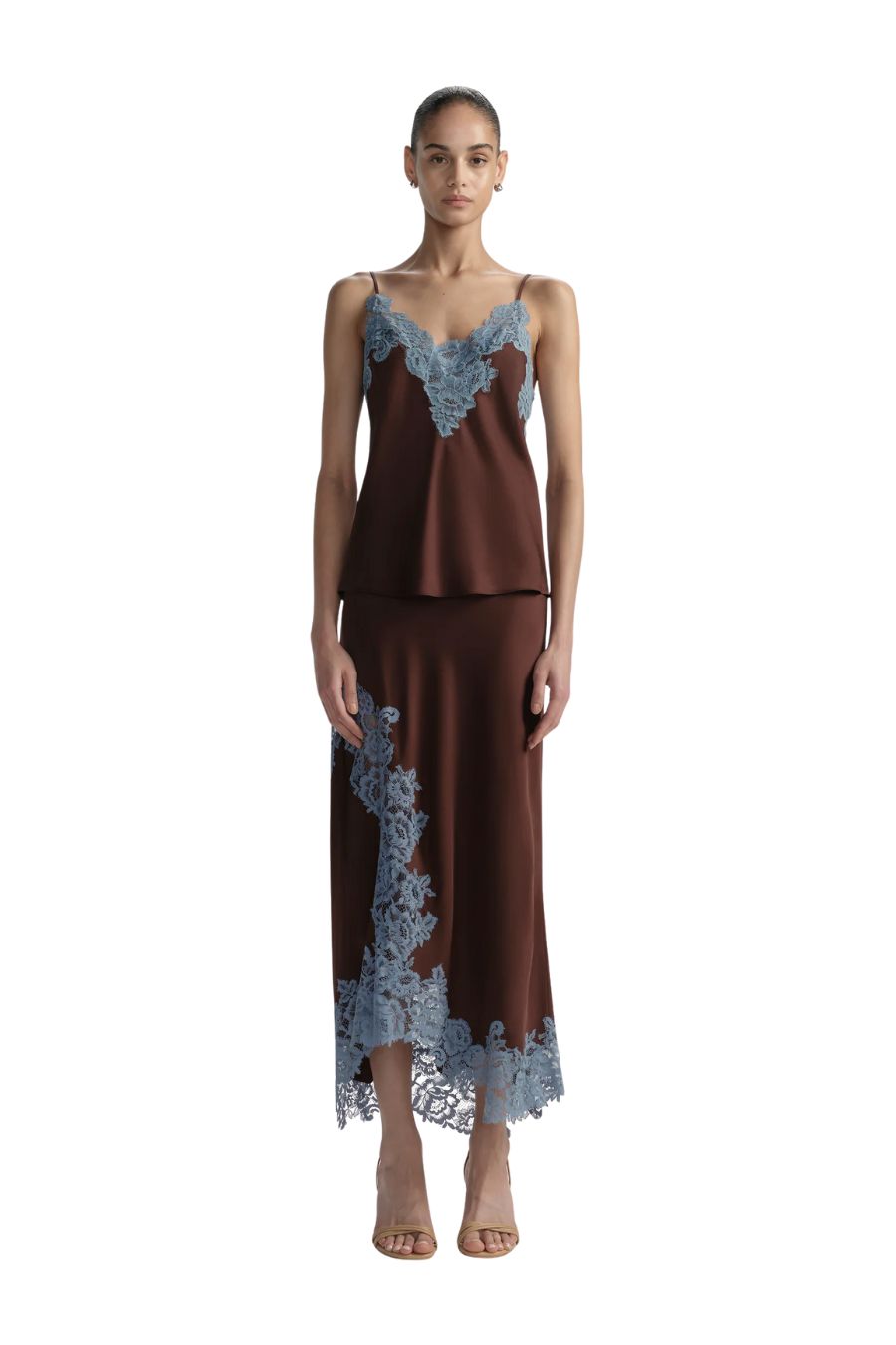 The Olivia Skirt is crafted from fluid viscose with a soft drape and subtle sheen in a deep ganache hue. This midi silhouette features contrasting French blue lace inserts along the hem.