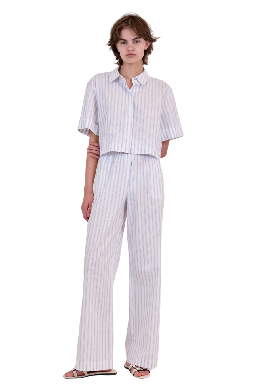 The Ryett Shirt in French Blue This short sleeve top offers a blend of classic tailoring and contemporary style. The neat collar and clean button-up front give a nod to traditional design, while the cropped cut and breezy short sleeves add a modern twist.