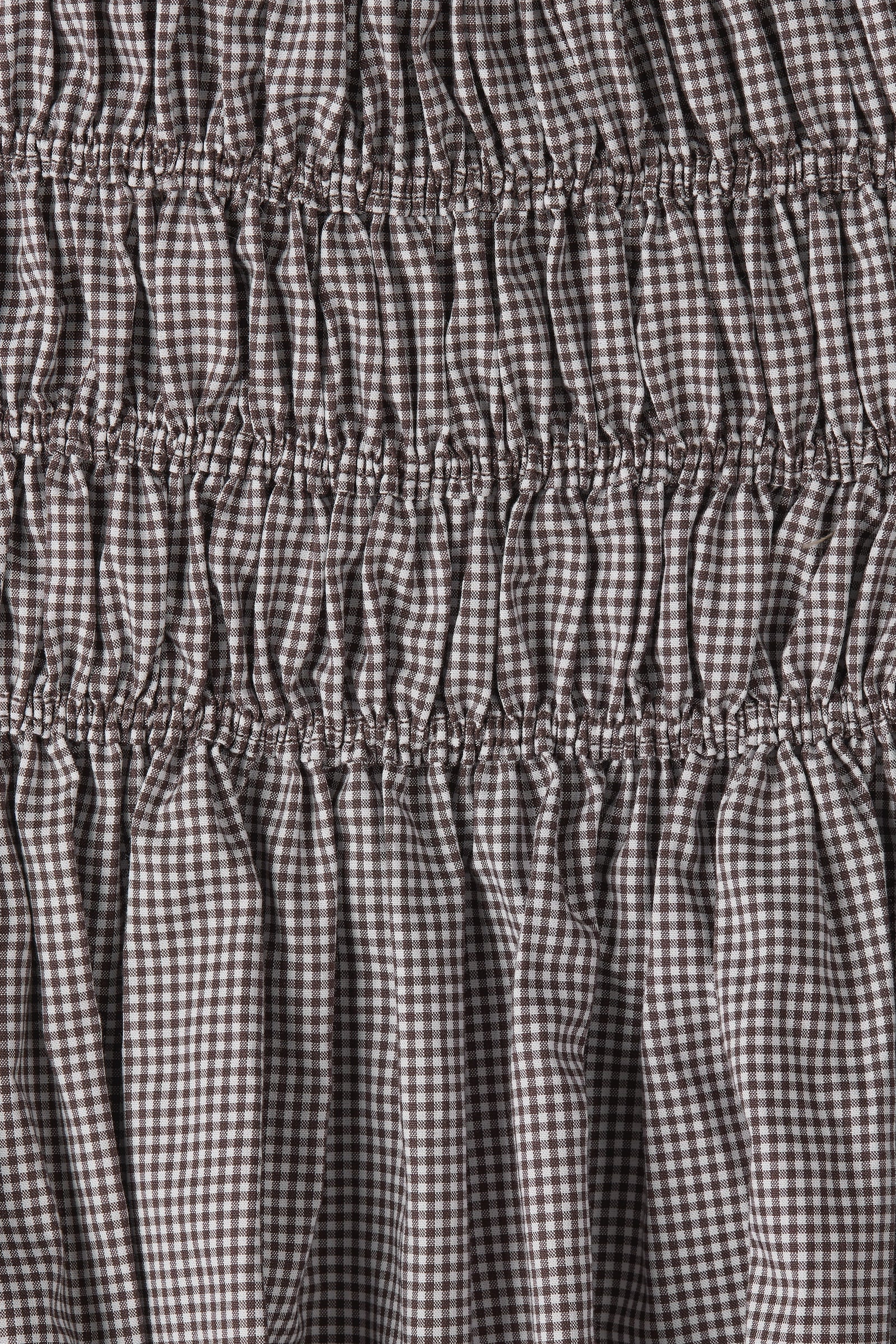 A vintage-inspired maxi dress with a scooped neckline and simple bow detail at the front bust, along with thin straps, adjustable in length. Its waist is shirred with three tiers of pipe elastic for a cinched silhouette. From there it flows into a gathered A-line skirt with a wide peplum hem, cropping around the ankles. Designed in 100% BCI Certified cotton in a coffee brown gingham print, style with a ballet flat for simple weekend wear.