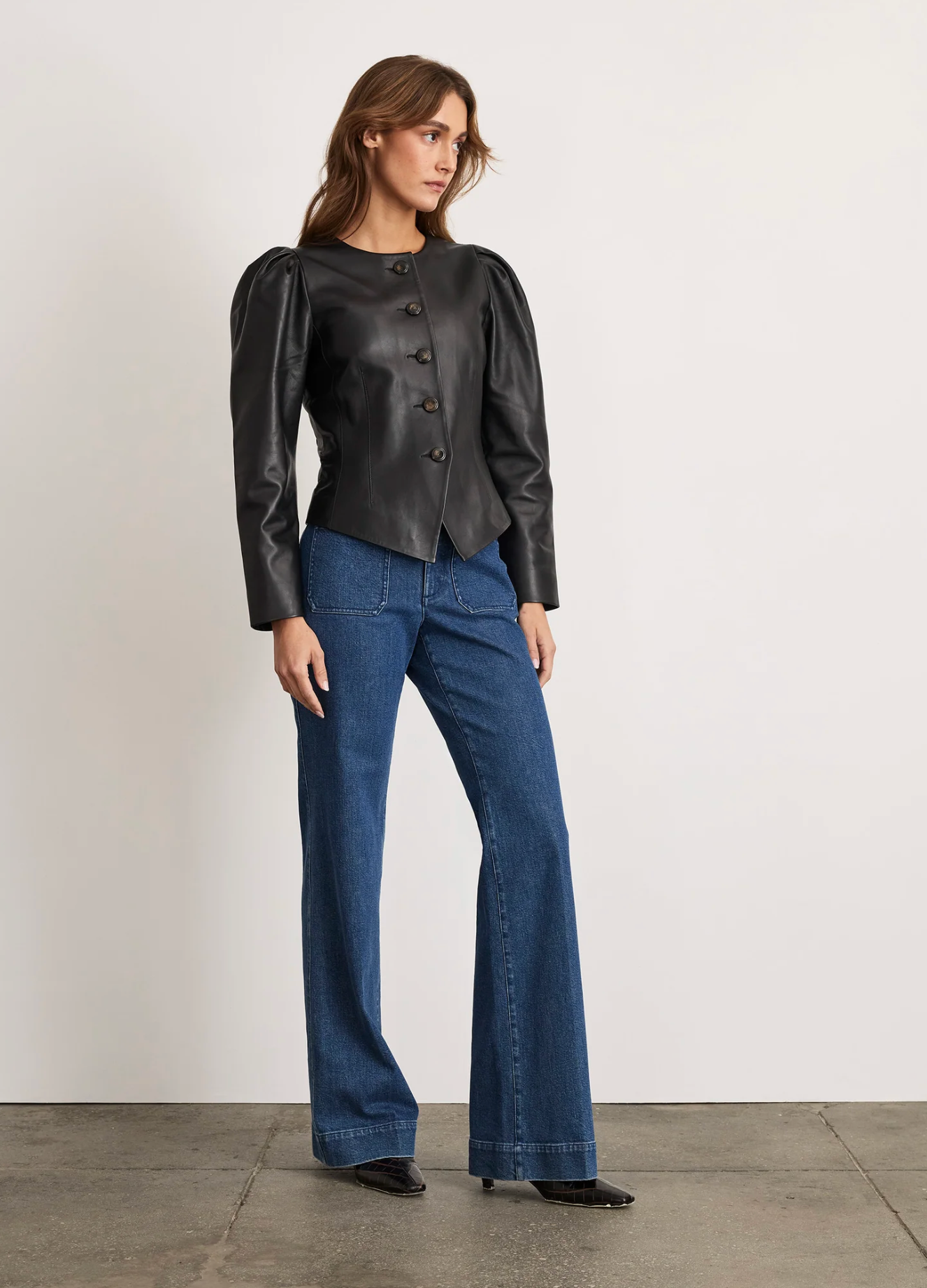 Designed in a luxe leather and featuring a sleek fitted silhouette with a crew neck, button up front, and slight puff sleeves, Sydney is thoughtfully designed with perfect proportions and refined details throughout.