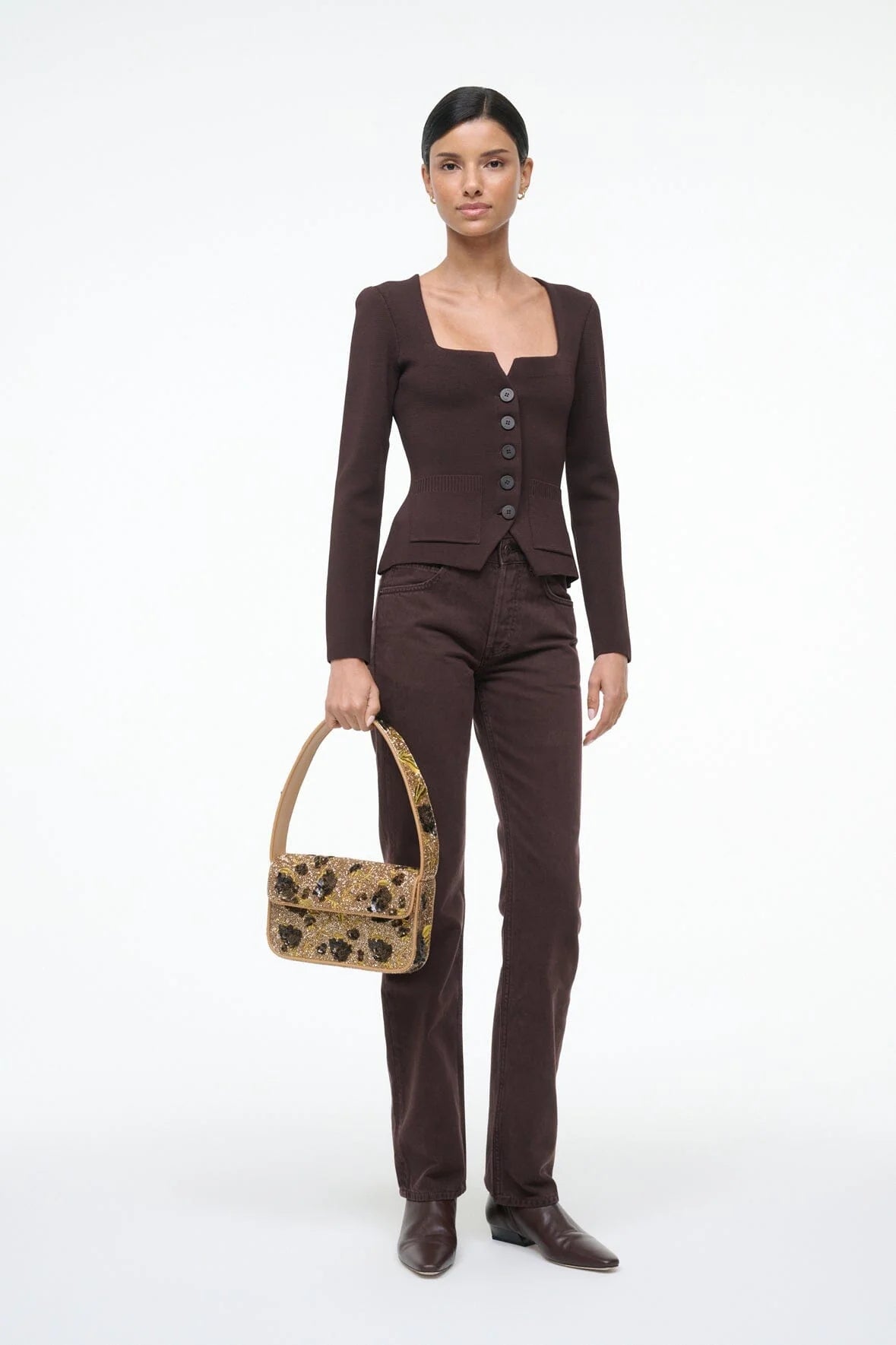 - Self: 100% Glass Beads; Base: 100% Rayon; Trim: 100% Vegan Leather Piping