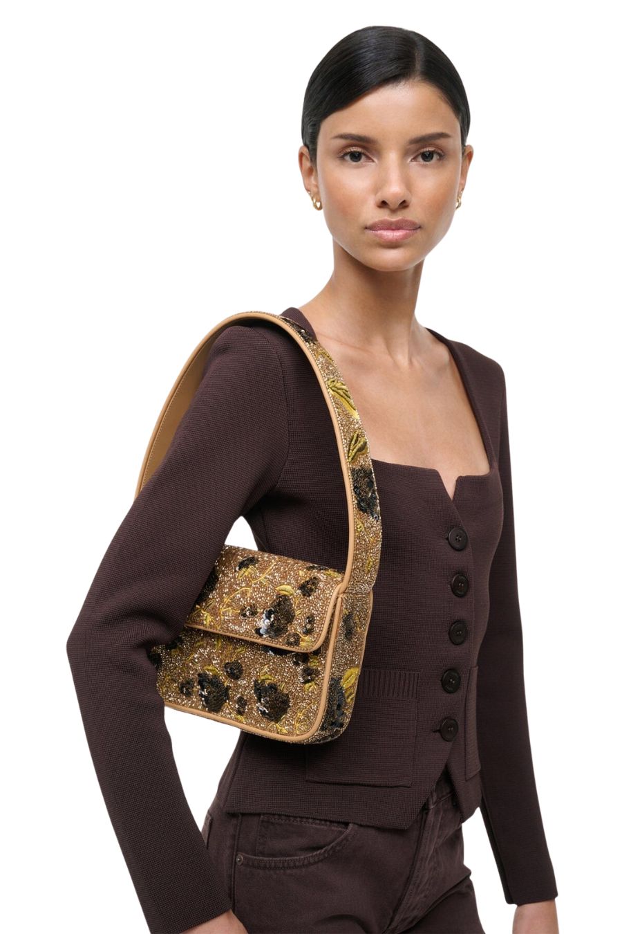 Our latest limited-edition Tommy features a seasonal vintage floral pattern. The Tommy Bag is a hand-beaded shoulder bag with vegan leather piping. This style features a single flap closure, inner zip, and a back slip pocket.