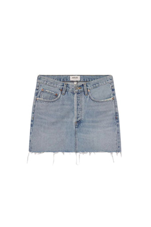 Looks Like: Vintage marbled light indigo denim mini skirt with fading, whiskering and a V shaped front rise